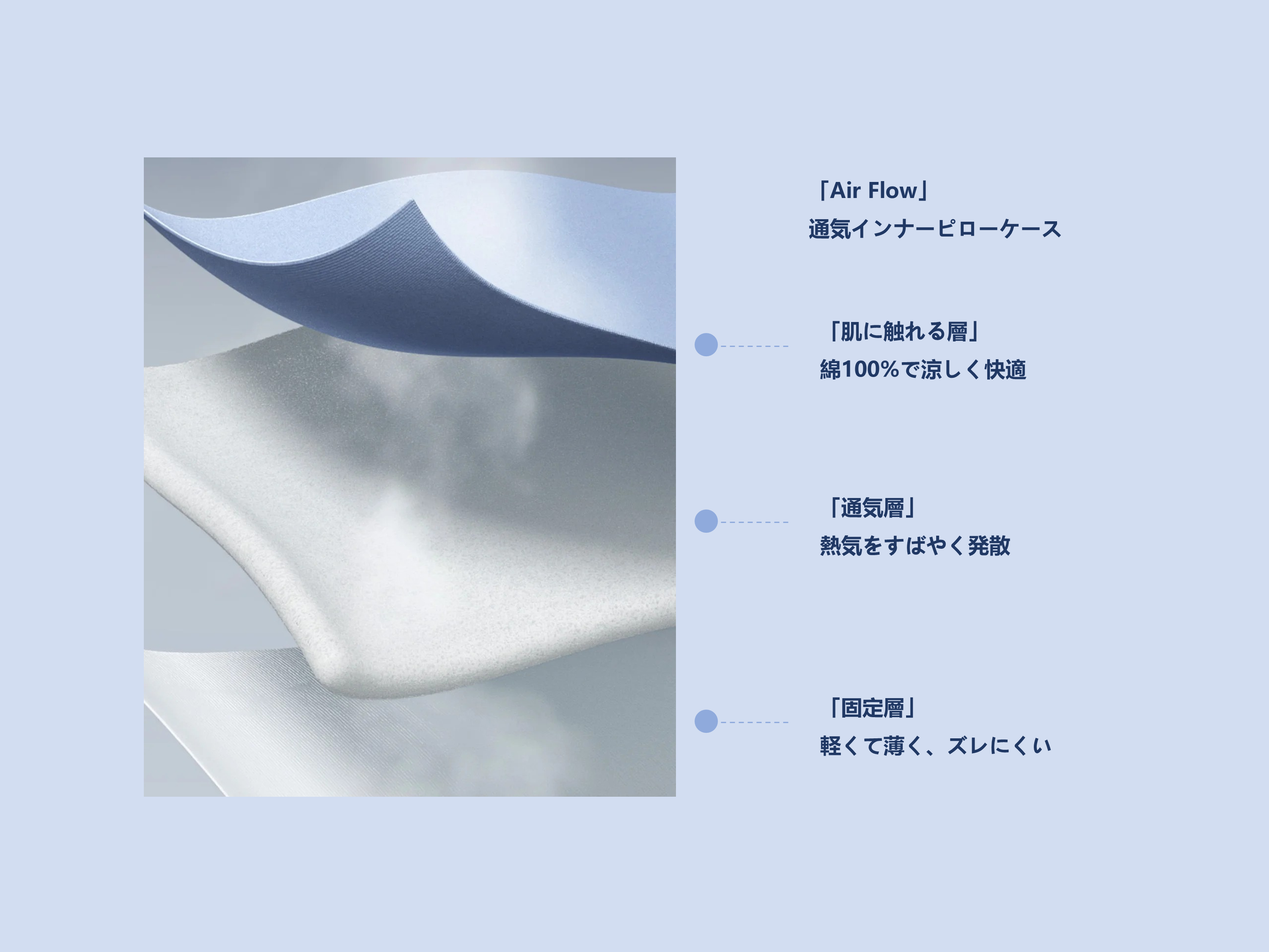 枕カバーは上下で使い分けができ、片面はひんやりとした接触冷感、もう片面はやさしい肌触り。季節や気分に合わせて使い分けることで、より快適な眠りをサポートします。