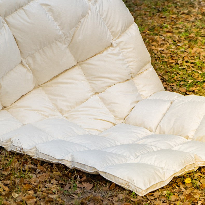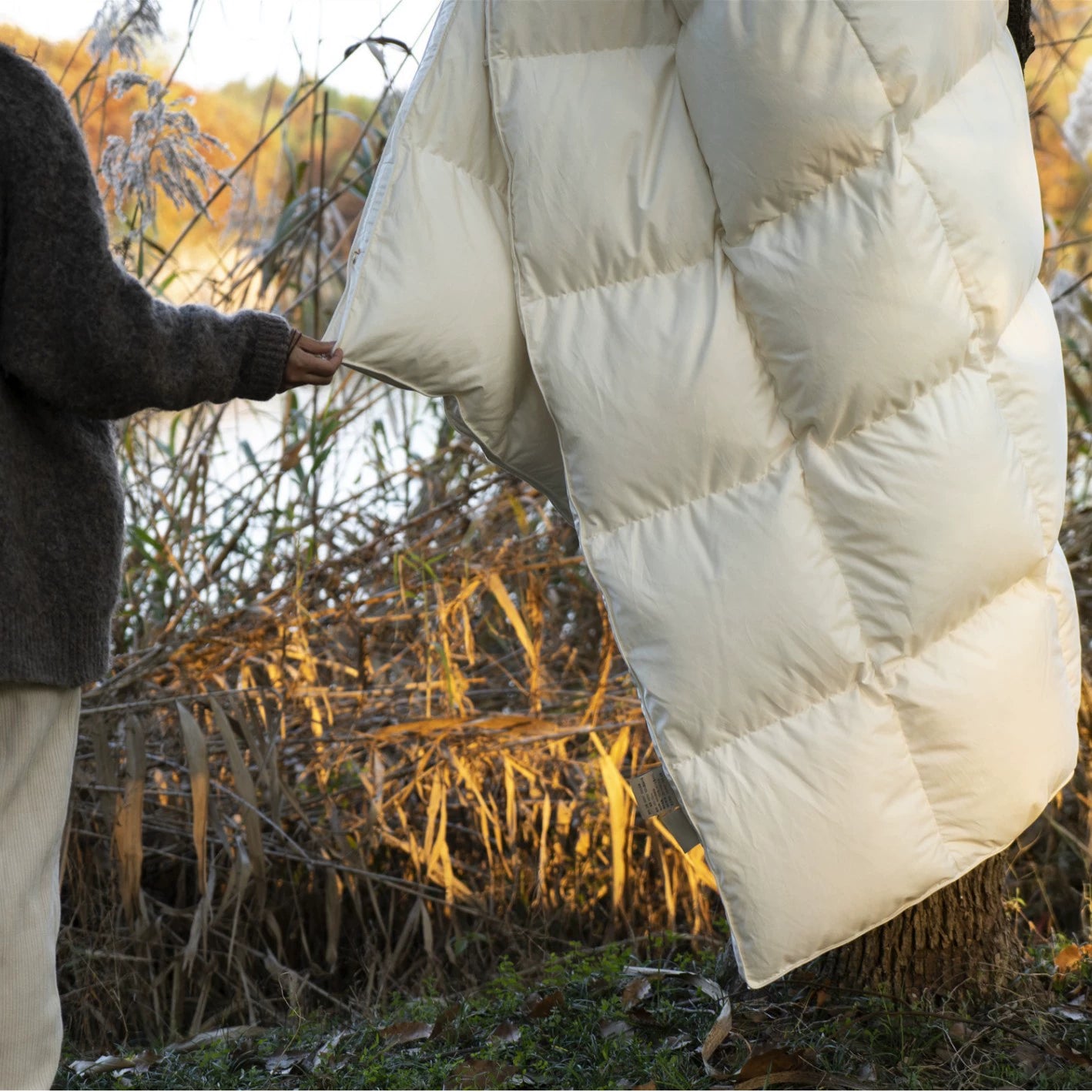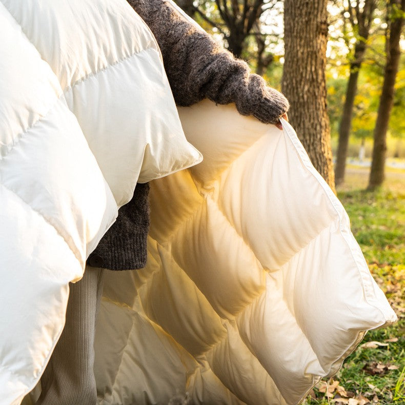 高密度織り生地と防羽加工:羽毛布団には高密度織りの生地を使用し、防羽加工を施すことで、やわらかな風合いと心地よい肌触りを保ちながら、羽毛の吹き出しを防ぎます。