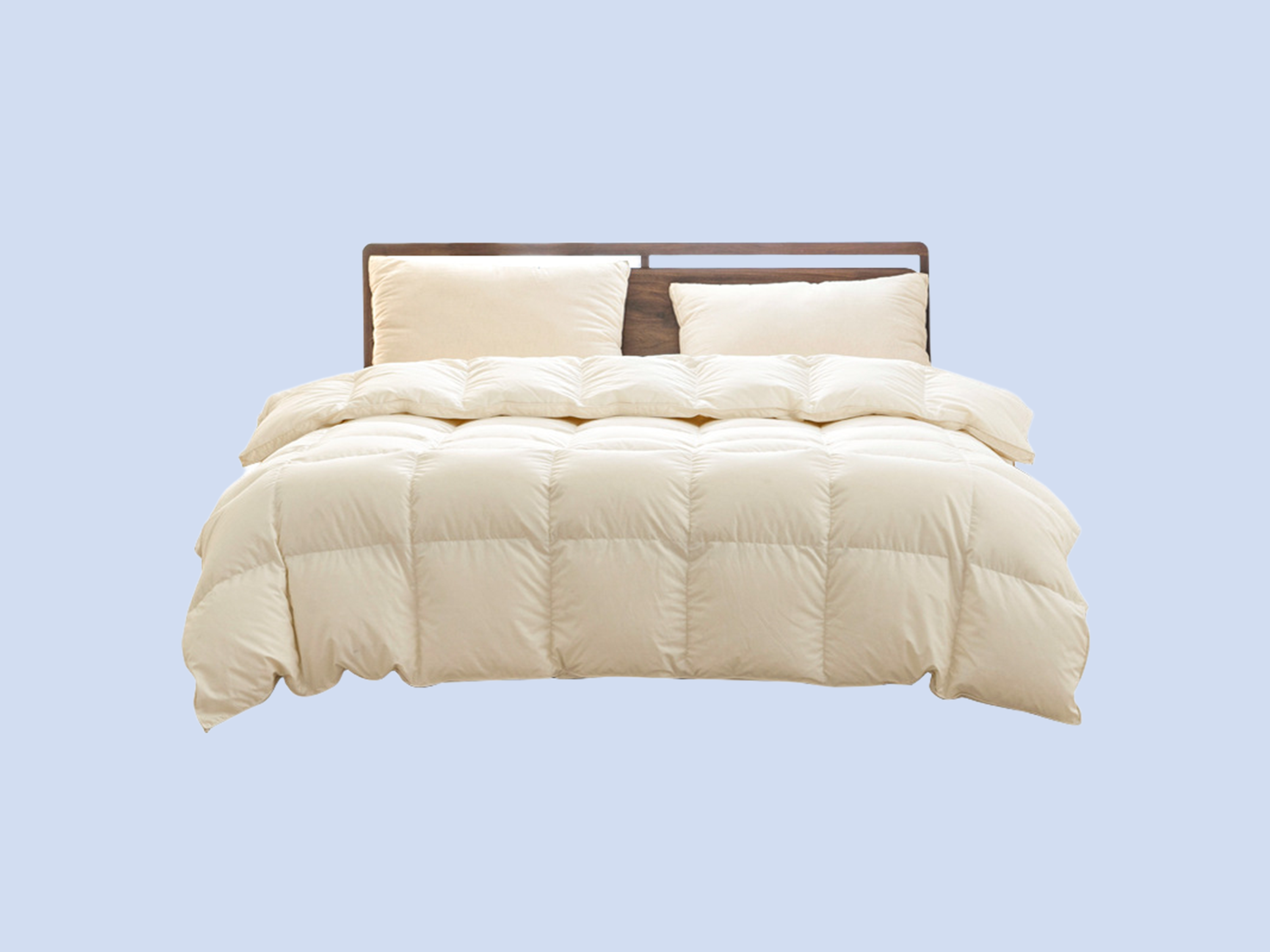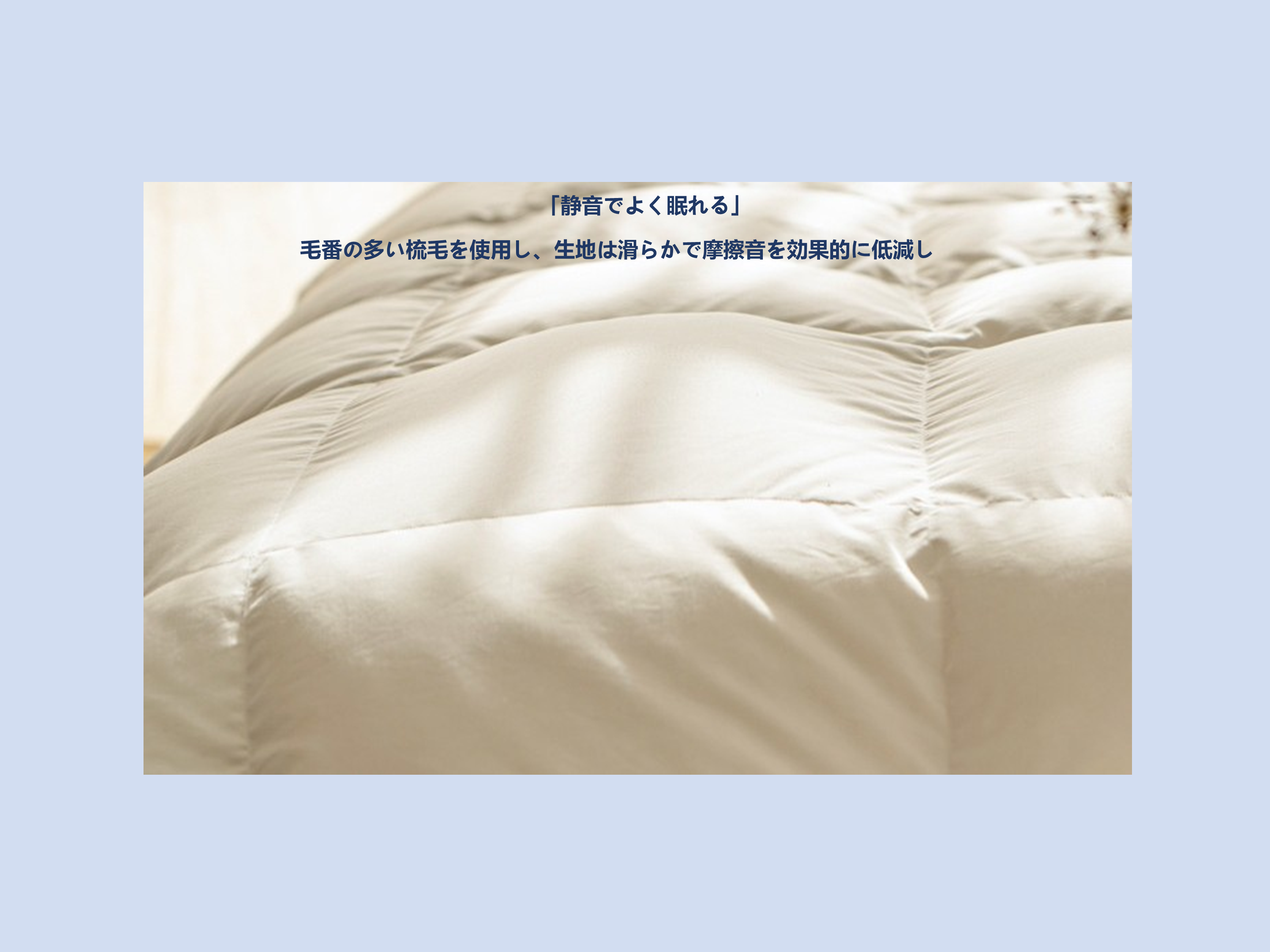 この羽毛布団は、上質な高密度長綿生地を使用し、95%のポーランド産ホワイトグースダウンを使用しています。また、ダウンが抜けにくい加工が施されており、布団は音の低減処理も施されているため、品質が保証されています。
