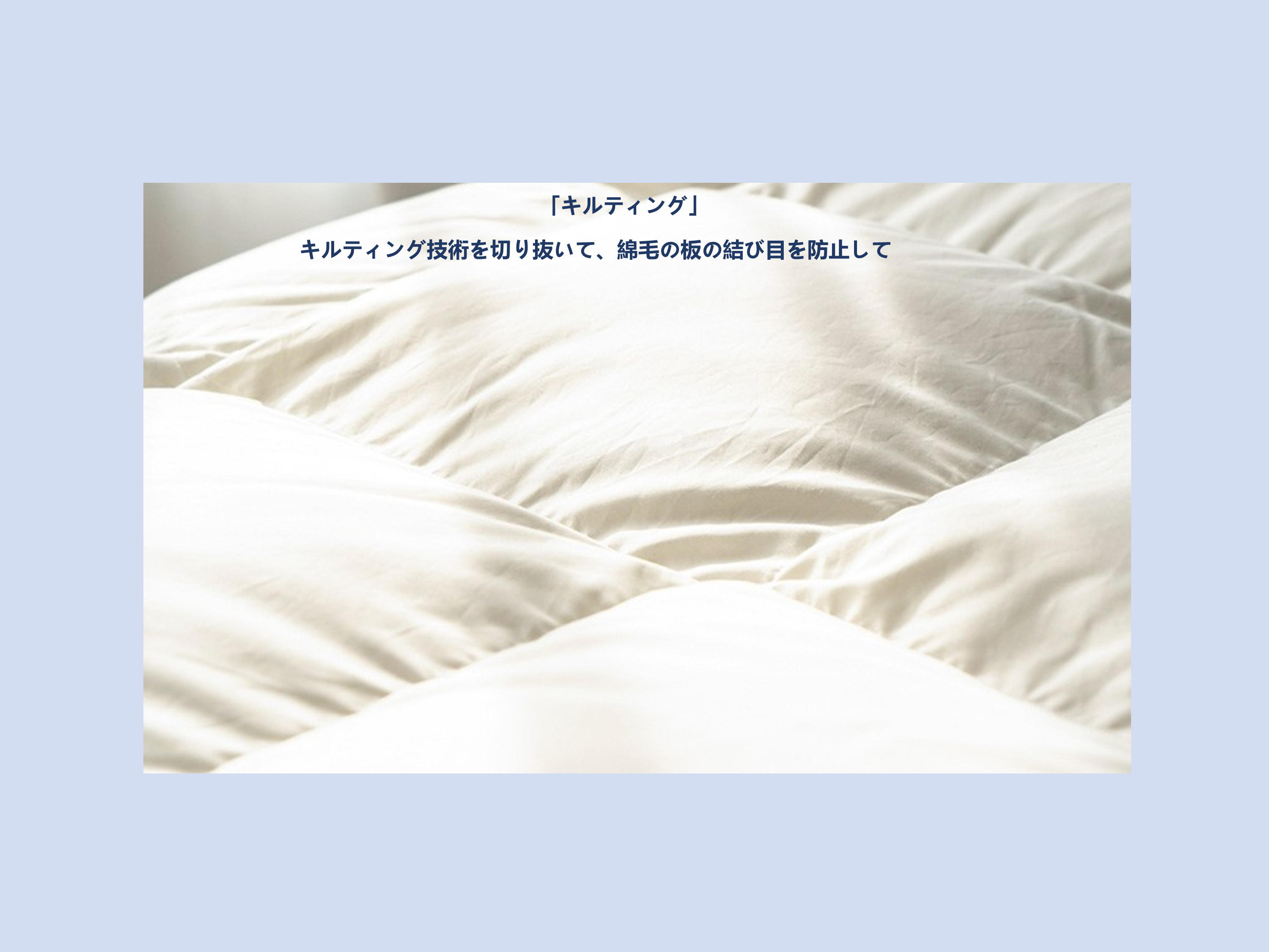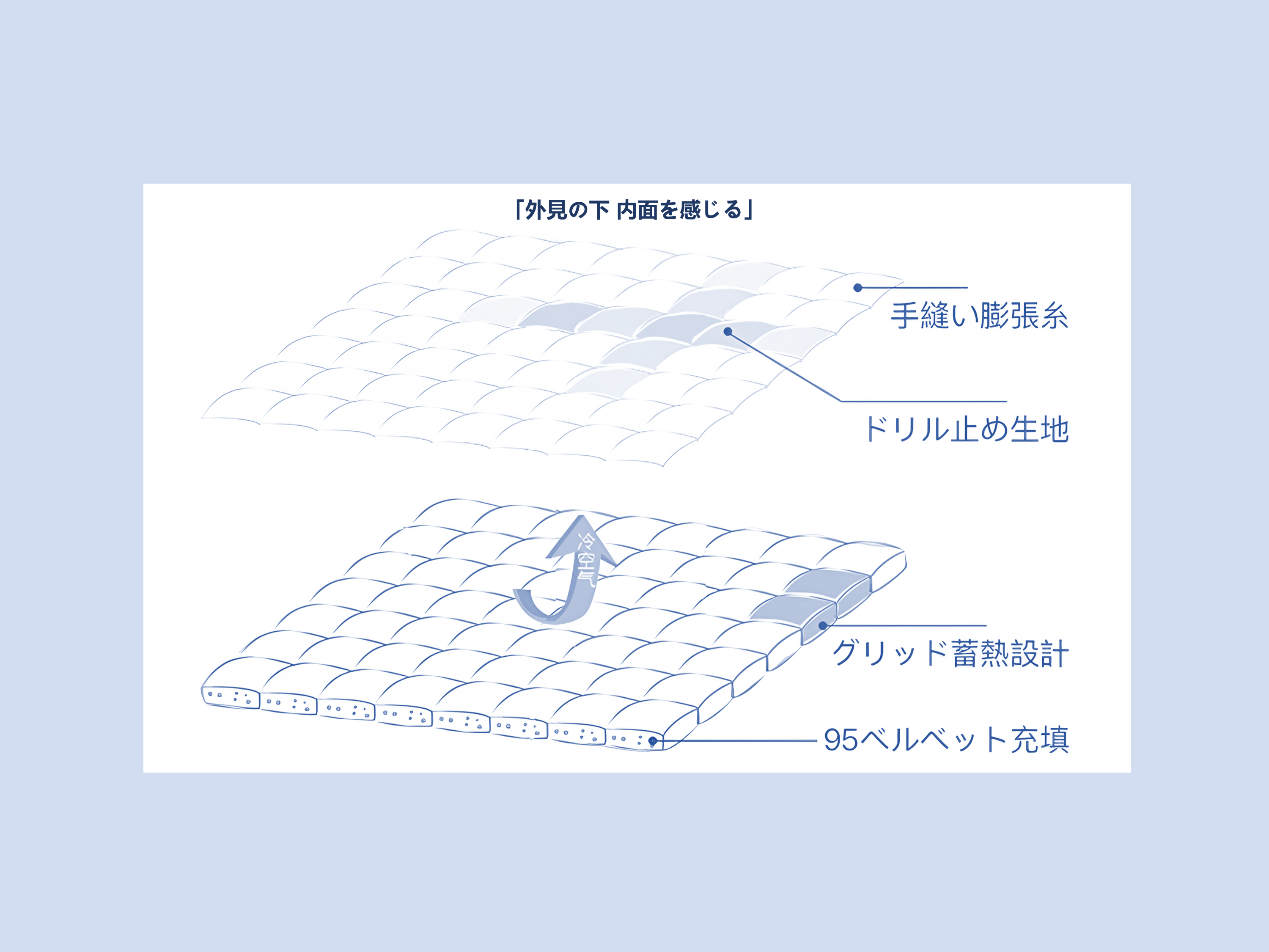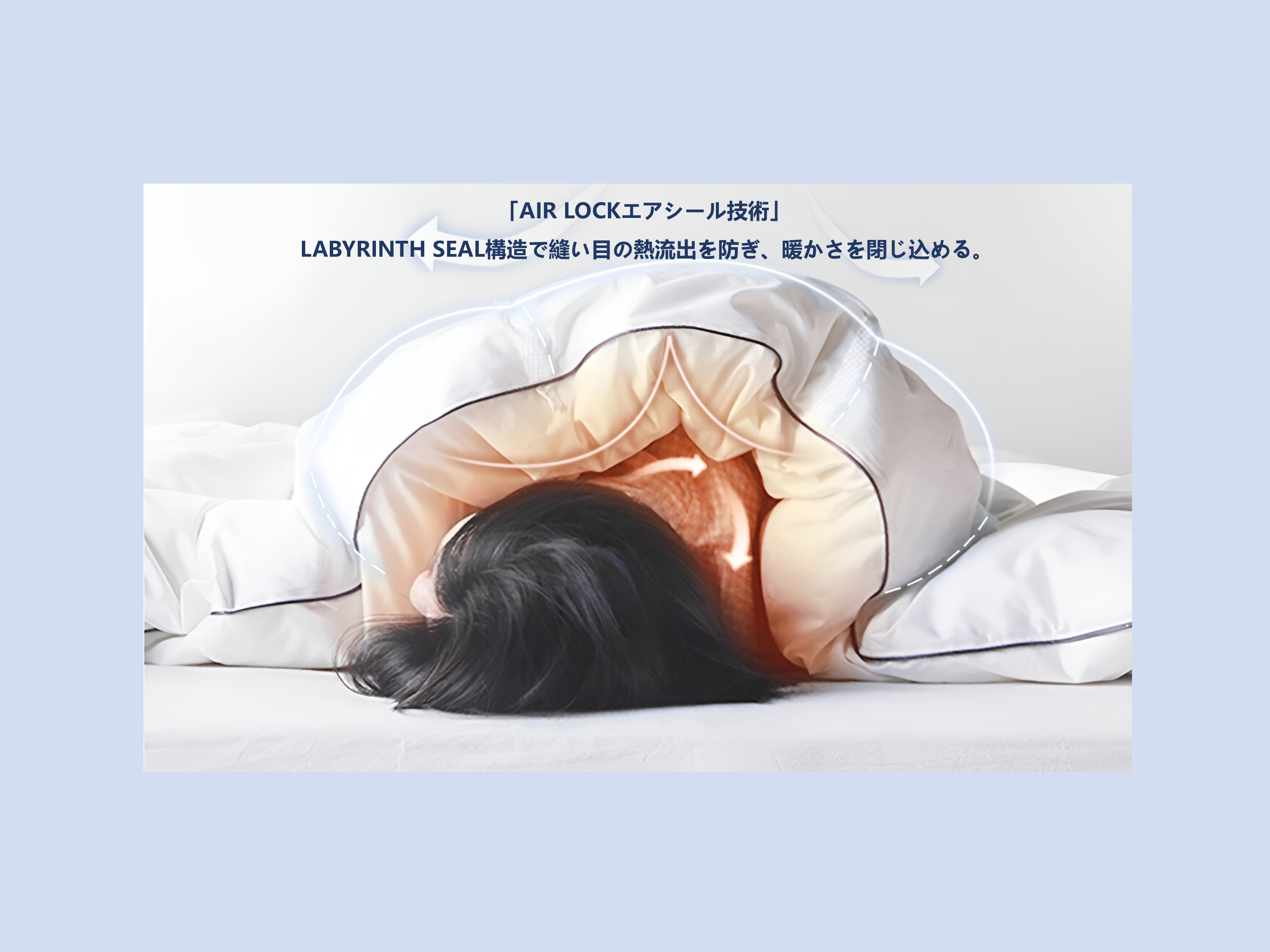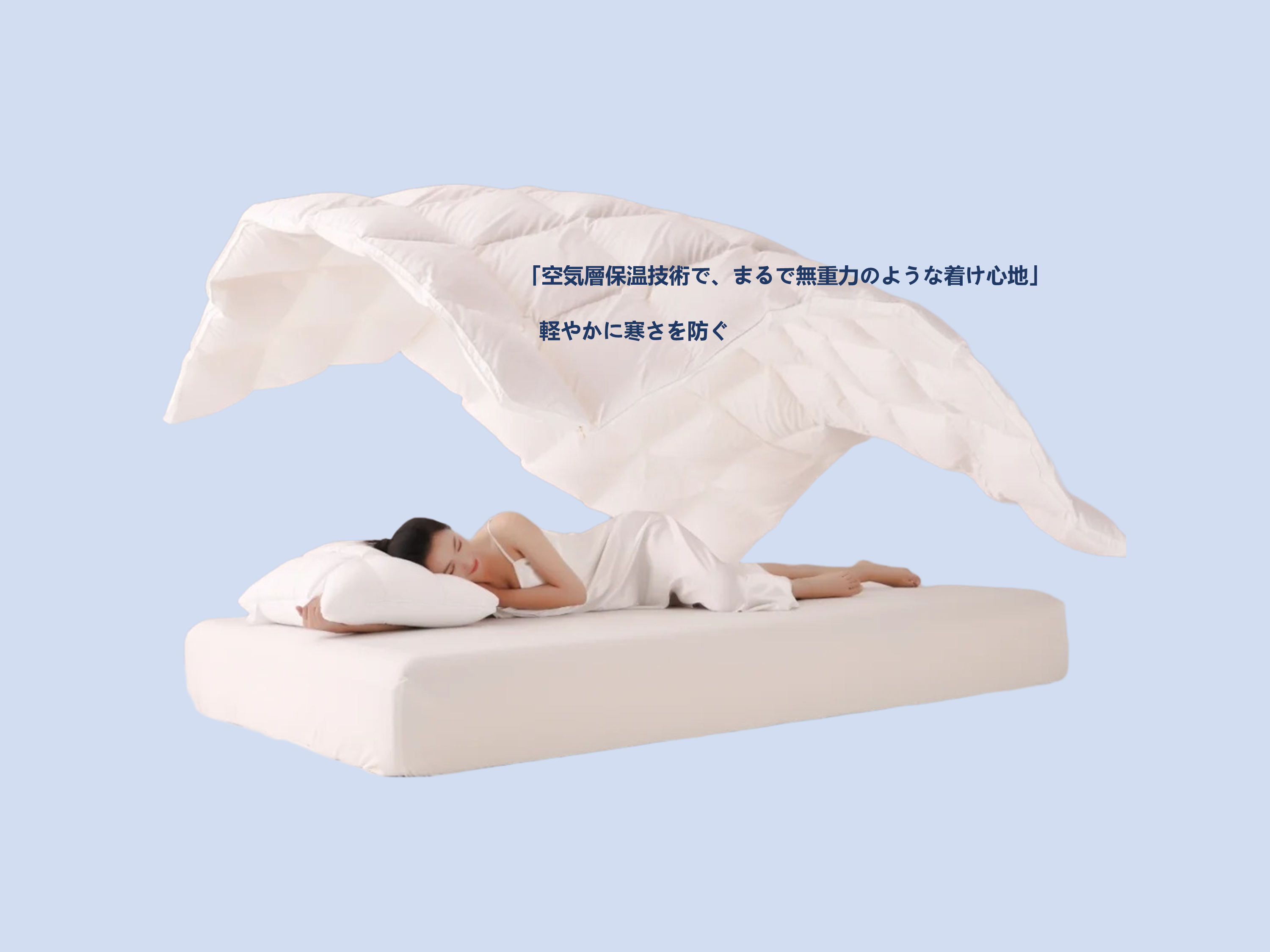 微小循環真空層設計とカプセル構造充填技術:微小な空気循環を促す真空層設計と宇宙カプセルのような立体的な充填技術により、布団内部の空気をふんわり保ち、暖かさと快適さを両立させています。