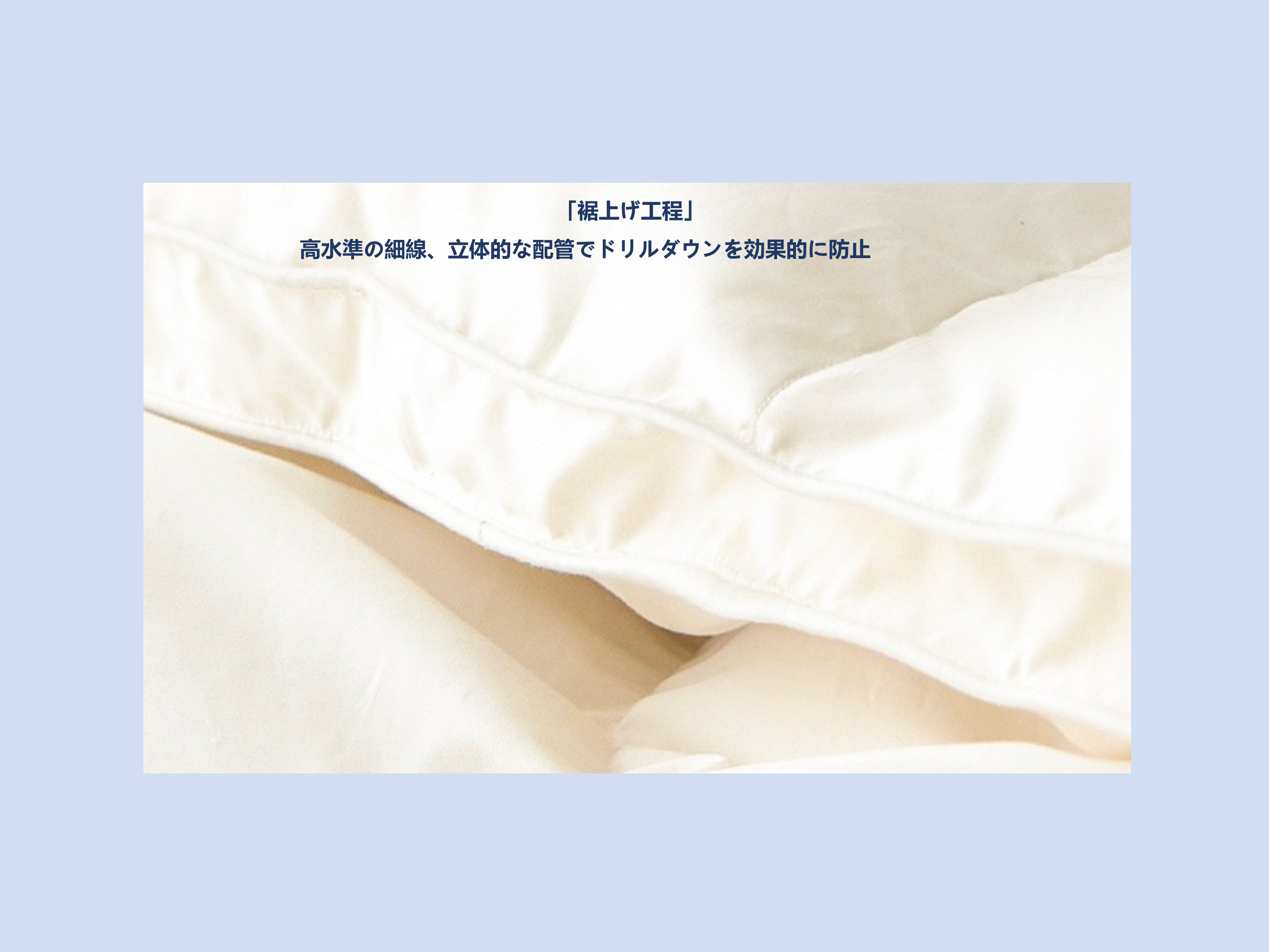 完全立体キルティング技術:独自開発の「完全立体キルティング」技術を採用し、中の羽毛が片寄ることなく一定の位置に保たれ、常に高い保温効果を発揮します。