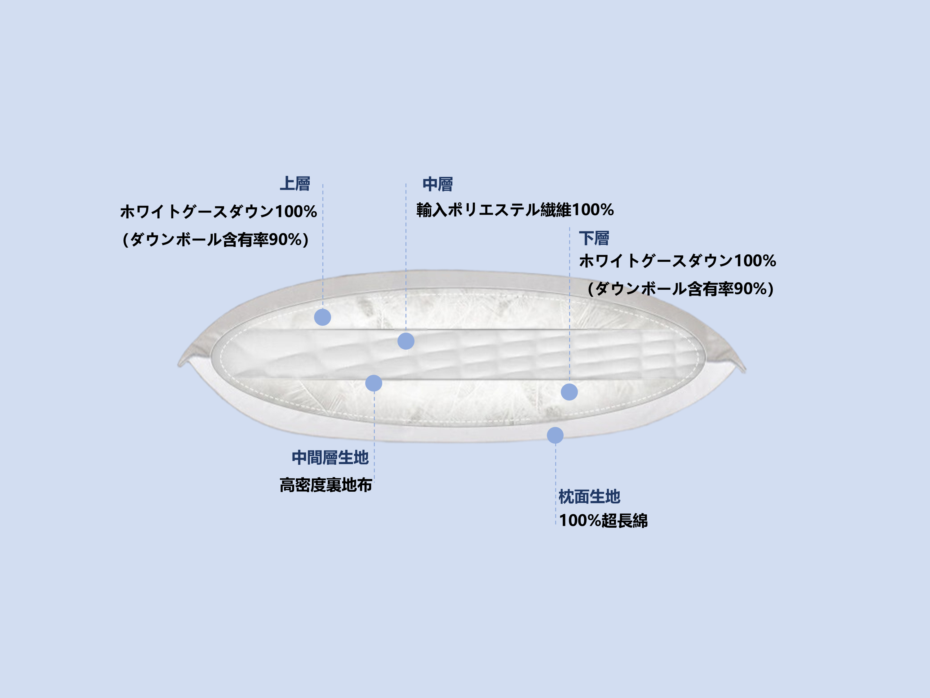 黄金バランスの素材構成:上層:90%高純度ホワイトグースダウン(腹部ダウン)。中層:高密度の輸入ポリエステル繊維サポート層。下層:100%長繊維コットン使用、高密度ダウンプルーフ生地。